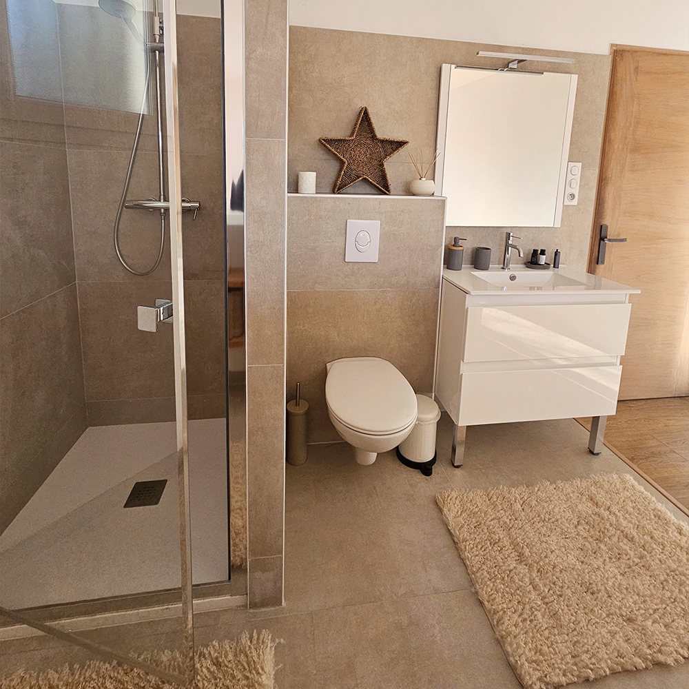 • 1 salle de bains (double douche + double-vasque + WC + lave-linge).
