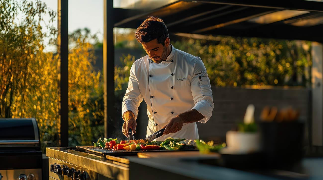 Il y a des soirs où l’on n’a pas envie d’aller ailleurs. Juste de rester là, dans le calme du Domaine, à profiter de la douceur du moment. C’est précisément à cet instant que le chef arrive. Sans bruit, sans précipitation. Comme une présence qui sait se faire discrète, mais qui change tout.